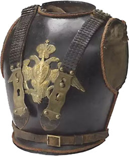 Кирасиры носили палаш, кожаную каску с гребнем из конского волоса (для защиты головы и шеи от сабельных ударов), перчатки с крагами, высокие сапоги с наколенниками – ботфорты. И, конечно, кирасу.