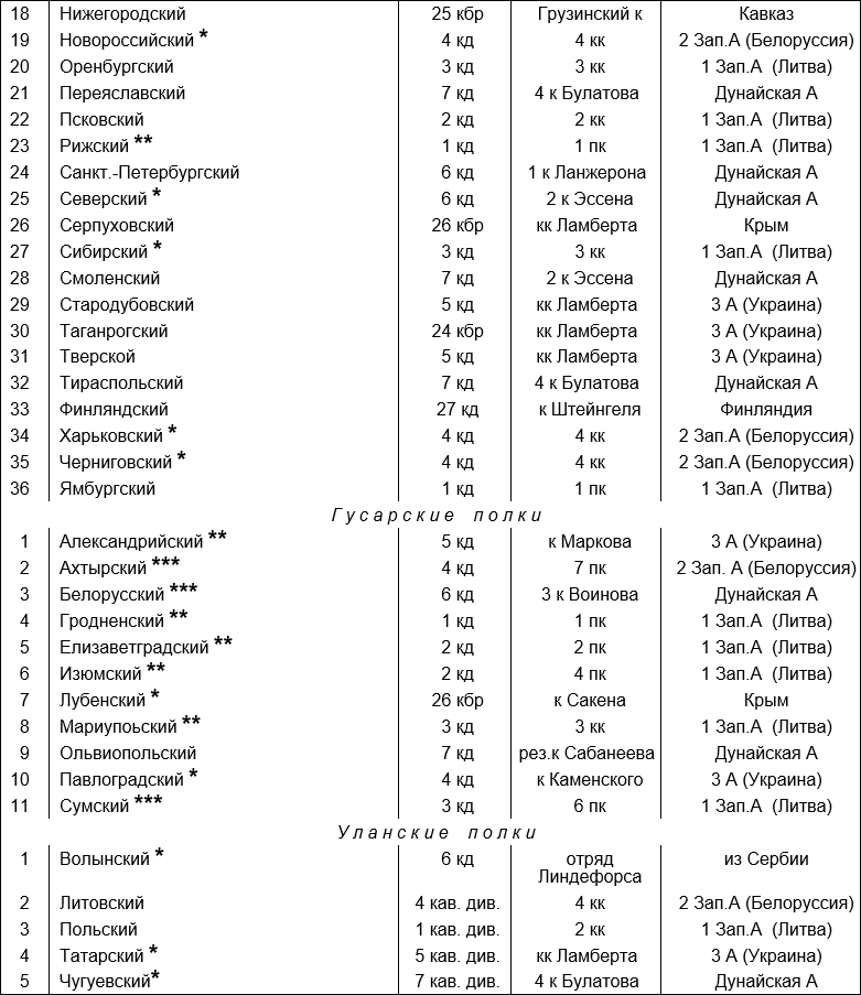 Номеров кавалерийские полки в то время еще не имели. Казачьи полки именовались по фамилиям командиров.