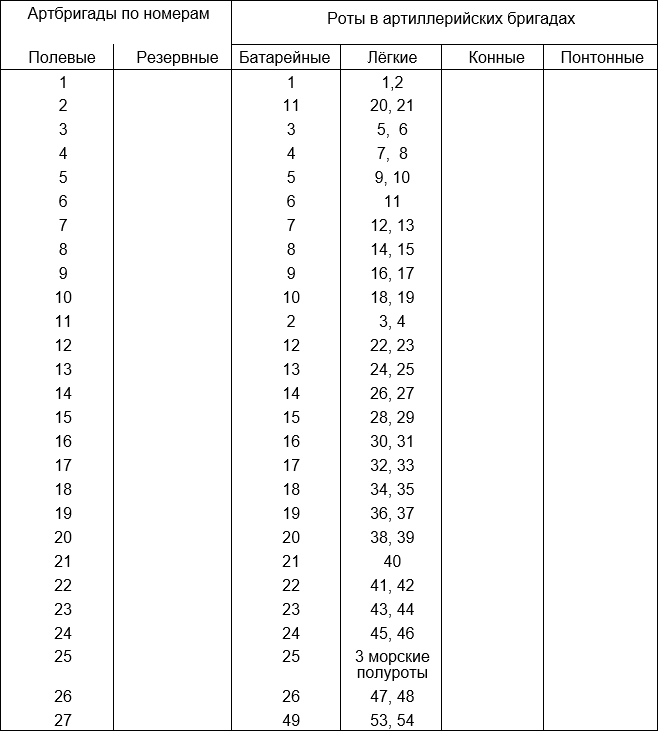Роты объединялись в артиллерийские бригады. Состав бригад был такой: