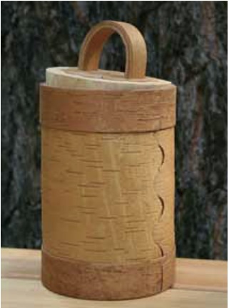 Затем, снятую кругами и цельную (не разорванную) бересту (сколоту) запаривали в горячей воде, заворачивали снизу и сверху, оборачивали вторым слоем бересты – «рубашкой» (уже не цельной, а с замком) и ставили дно. Оно выпиливалось и подгонялось впритирку. Береста после кипятка ссыхалась и дно держалось очень крепко. А сверху делали крышку с дужкой или скобкой.