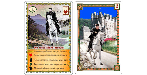 Всадник также указывает на обмен информацией в любой форме, будь то телефонный звонок, факс, телеграмма, электронное письмо или устное сообщение. А уж положительной или отрицательной окажется эта информация, сообщат соседние карты. В комбинации с картами Сад или Букет, Всадник может символизировать приход гостей, предвещать новые встречи, свидания, визиты, приглашения.