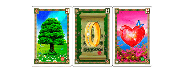 – Кольцо+Букет – зачастую обозначает предложение руки и сердца, а также помолвку. Если рядом будет находиться карта Сад, то в случае уместности такого предположения, может обозначать свадьбу.