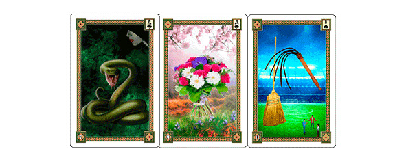 Хочу пояснить один момент, который иногда волнует начинающих «ленорманистов». Они сомневаются в том, как нужно правильно называть сочетание из трёх карт, поскольку разные мастера называют эту конфигурацию карт по разному. Это дело личных предпочтений. Мне, например, нравится слово «триада». Но вы можете называть эти три карты как «трио», «триплекс», «триплет», «триумвират» или как-нибудь ещё. Это не имеет никакого значения.
