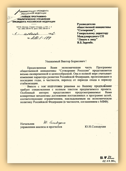 Такое письмо, конечно же, порадовало меня, так как в нём достаточно объективно оценивалась актуальность предложенной программы для того, весьма сложного периода экономического развития России, и особо подчёркивалась целесообразность её практического воплощения с целью смены вектора финансово-экономической стратегии государства путём создания условий для преодоления ограничений, воздвигнутых после лукаво-либерального переворота августа 1991 года всемирными монетарными организациями, подобными Международному Валютному Фонду, в отношении экономической политики Российской Федерации.