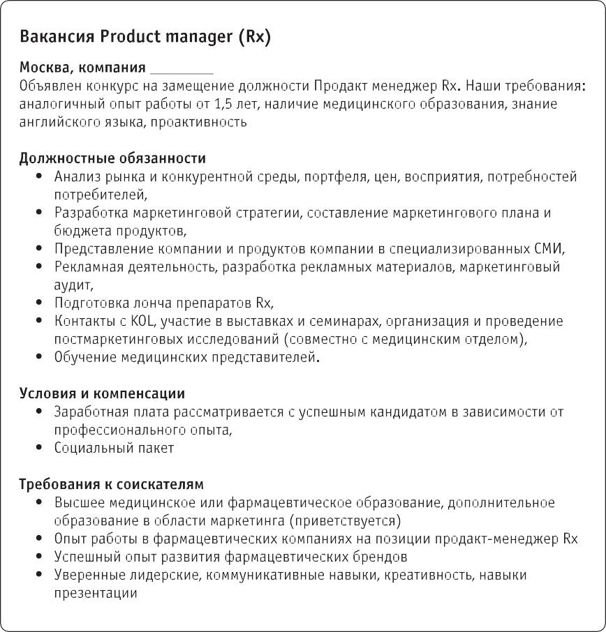 Объявление типичное и, на первый взгляд, довольно полно охватывает круг обязанностей менеджера по препаратам. Вместе с тем за внешне понятным описанием обычно скрываются многие «подводные камни». У вдумчивого соискателя один за другим возникают следующие вопросы: Какой препарат ему поручат? Каков объём продаж и, что самое важное, как препарат выполняет план? Каково его положение на рынке и динамика? На какой стадии жизненного цикла он находится? Не является ли «проблемным ребенком» (по матрице BCG)? На каком или каких сегментах рынка он продвигается? Какие источники данных о рынке используются в компании? Какова структура компании? Есть ли поддерживающие функции (support functions)? Как возникла объявленная вакансия: в процессе расширения отдела или в силу ухода/увольнения менеджера? Что случилось и почему ушёл предшественник? Каков потенциал развития: есть ли плановое обучение маркетологов, тренинги, возможен ли позиционный рост? Эти и многие другие вопросы должны возникнуть у соискателя, желающего открыть себе дорогу в отдел маркетинга или перейти в отдел маркетинга другой компании. К чему все эти вопросы и нужно ли их задавать работодателю? Абсолютно очевидно, что новичку, даже с определенным опытом работы, не поручат успешный прибыльный препарат, приносящий компании солидные продажи, растущий и являющийся лидером на рынке. (Исключением является ситуация, когда компания исповедует стратегию перекупки «звёзд» с рынка, о которой мы поговорим особо). Представьте, что вам сделали предложение о работе. И вы на крыльях летите в офис в свой первый рабочий день. А там вас ждёт неожиданная для вас ситуация: бесперспективный препарат, характеризующийся устаревшей (на фоне конкурентов) формой выпуска и высокой ценой, который много раз пытались вывести из промоции; отсутствие интереса к нему со стороны медицинских представителей, равнодушие служб поддержки и многое другое. Проходит не более месяца, и от вашей «окрыленности» не остается и следа. Чтобы избежать неприятных неожиданностей и, как следствие, не растерять запал, энтузиазм, не убить свою мотивацию, желание стать настоящим маркетологом, нужно перед собеседованием, а также перед тем, как принимать предложение, собрать как можно больше информации из внешних источников, с сайта компании, от знакомых, с форумов сообществ. Ознакомьтесь с декларируемыми ценностями (Values) компании, чтобы понять, насколько они близки вам. На собеседовании, не пугаясь, задавайте вопросы потенциальному руководителю для того, чтобы составить, возможно, более полную картину своей будущей работы. Это позволит вам взвесить свои силы, проанализировать возможности и принять сознательное решение о работе. В определенных случаях риск оказывается оправданным, даже если условия, в которых вы начнете работать, далеки от идеала. Например, вы видите, что работодатель ищет не «козла отпущения», а желающего разви- ваться перспективного сотрудника, который сможет показать себя в деле с лучшей стороны, работая в трудных условиях. В этом случае вы с удовольствием приступите к работе, и вам не придется решать «уравнение со многими неизвестными».