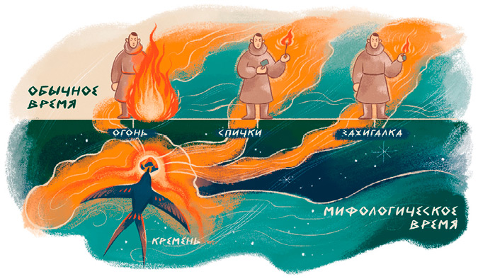 Чтобы объяснить мир, надо рассказать, как он создавался в правремя. В этом и заключается влияние мифа на то, что происходит сейчас. Если знаешь, как произошел огонь, сможешь им воспользоваться и не обжечься. Если знаешь, как бог создал ядовитое растение, им не отравишься.