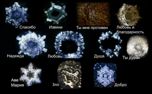 Также достаточно известен эксперимент с водой, когда на воду воздействовали ментальным намерением и затем замораживали ее. Рисунок замороженных частиц воды был очень разным и соответствовал ментальному намерению, в него заложенному. Самые красивые рисунки были на благоприятных мыслеформах.