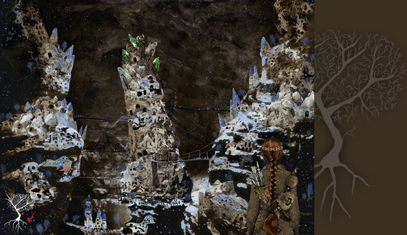 …Ход выходил почти под самым сводом скалистой пещеры. От выхода мелкими ступеньками вилась крутая дорожка вниз. Пещера оказалась просто огромной, по ее колючим уступам везде были раскиданы домики озерных селян. Они высечены прямо в скалах. Высокие, как острие стрелы, крыши домов мерцали и переливались голубоватым светом. Везде оживленно ходили озерные жители. Переходили по каменным и висячим мостам, мелькали в окнах, трудились во дворах своих чудных домиков. По всему городку росли деревья, также светящиеся слабым голубым сиянием. Низкорослые растения похожие на наши грибы всюду торчали из камней и росли почти на всем: дорожках, мостах, крышах, стенах…. В озерцах раскиданных тут и там копошились светящиеся крабы. От всех этих диковинных существ и растений исходило столько света, что озаряло им почти всю великую пещеру. От краев и уступов пещеры на разной высоте спускались легкие, качающиеся от проходивших человечков мосты. Все они сходились у узкой, невероятно высокой каменной башни в центре пещеры. Она вся была усыпана дырами окон и входов. Со всех сторон ее обвивали петляющие каменные дорожки. Самый высокий край башни был украшен очень крупными, больше нашего роста, зелеными изумрудными камнями. Дно пещеры заливало глубокое темное озеро, а со скал с грохотом разъяренного бога, спускались огромные узкие водопады. По воде плавали лодочки с озерными жителями. Вот она какая была наша река Черная Риндигайда! Такая спокойная и неторопливая на земле нашей деревни Иржи, бурная, загадочная и сильная, здесь в скалах…