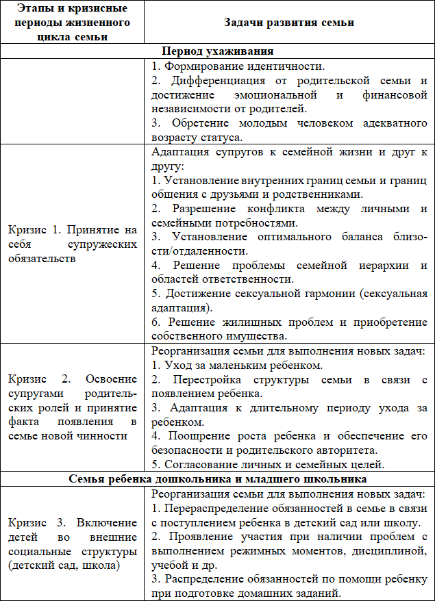 Таблица 1. Динамика отношений в семье (интегрированная периодизация жизненного цикла семьи).