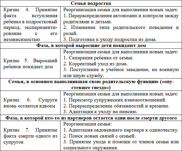 Выход из кризиса сопровождается либо установлением новых отношений между членами семьи, принятием новых ролей, нового уровня взаимопонимания и взаимодействия, либо (при попытке любой ценой сохранить прежний тип взаимодействий) – нарастанием степени эмоционального отчуждения и нарушением внутрисемейных отношений [6].