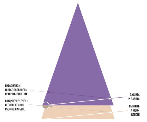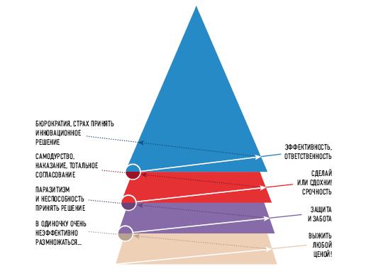 Когда племени постоянно грозит гибель, все его члены максимально напряжены и делают все возможное для общего выживания. Темная сторона этого уровня начинает проявляться, когда у племени все хорошо: есть большой запас еды, крепкие и надежные жилища, а плодородная земля возделана и защищена от посягательств врагов. Среди его членов появляются «паразиты» – те, кто создает меньше, чем потребляет. Видя, что, даже не слишком напрягаясь, можно получать столько же, другие соплеменники тоже начинают давать слабину. На этом уровне племя не способно само выгонять «паразитов». Ведь если сегодня я предложу кого-то выгнать, то завтра могут выгнать меня. Пойти на это никто не рискнет, ведь одному не выжить – это верная смерть (забегая вперед, скажем, что этот страх никуда не делся, и многие люди, когда их увольняют из организации, испытывают сильные негативные эмоции, близкие к страху смерти). На сильных членов племени ложится все больше и больше ответственности за выживание. К тому же при росте численности становится все сложнее и сложнее принимать решения. Племени начинает грозить гибель из-за «паразитов» и неспособности быстро делать выбор. Возникает потребность в переходе на следующий уровень Игры: в появлении сильного вождя, которому племя делегирует ответственность за свое выживание и наделяет правом быстро единолично принимать решения, распределять работу среди членов племени, а также, если работа не выполняется, – выгонять бездельников.