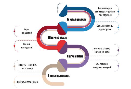 Игра в Правила[15] (синяя) – построена на принципах «перед правилами все равны» и «каждый имеет право на ошибку, но никто не имеет право на нарушение, то есть на повторение ошибки». На этом уровне возможно создание государств, в которых лидера выбирают на время и его полномочия ограничены. На красном уровне тоже есть правила, но они существуют только для подчиненных, а для лидеров действует принцип «Чем большее правил и законов ты можешь безнаказанно нарушить – тем выше твой авторитет». На уровне Игры в Правила все равны перед законом. Появляется нечто большее, чем эго лидера. И это – правда.