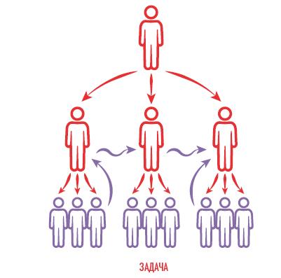 Лидер-руководитель указывает на многочисленные красные точки из рисунка выше и говорит, что люди должны сделать. Альфа-самец своего племени. «Или ТЫ ЭТО СДЕЛАЕШЬ, или будешь иметь дело со мной» – вот его принцип. Приказ и поручение – основные инструменты управления. Появляется иерархия, и над работниками всегда есть тот, кто за всех отвечает, организовывает и заставляет работать ради выживания племени. Чем глубже лидер погружен в происходящее в компании и чем оперативнее он находит зоны безответственности и закрывает их назначением поручений и принятием решений – тем быстрее реагирует организация на новые возможности. Пока лидер «держит удар», организация растет и развивается, причем очень быстро.