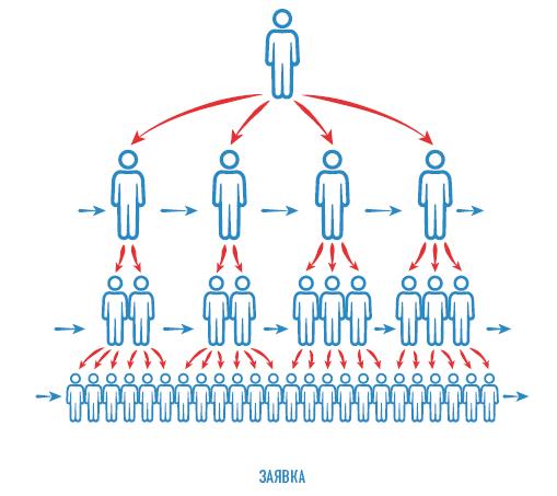 На синем уровне полномочия делегируются вниз, и появляется новая доминанта постановки задач – заявка. Заявка – это задача, которую сотрудники ставят друг другу в соответствии с зонами ответственности по горизонтали. Это кардинально отличается от доминанты поручений предыдущего уровня.