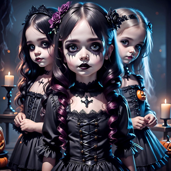 Крошка-вампирша привела в порядок свою куклу: мадам Пуари. Поменяла ей высокий парик с разбившимся кораблём, сделала макияж в стиле богини Миктлансиуатль. Надела на любимую игрушку пышное платье с корсетом, чёрными кружевами и черепушками.