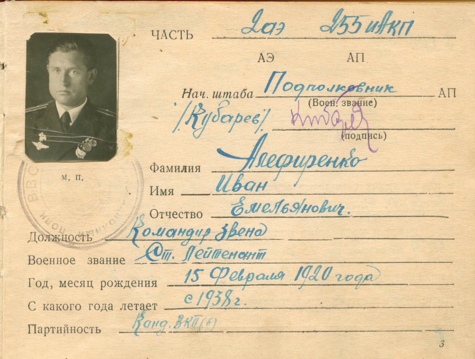 «…В начале сентября 1942 года Ивана Алефиренко направили на фронт. «Прибыл на Северный флот, – сообщил вдруг в одном из писем Иван. – Служу в должности командира звена в 255-м истребительном полку ВВС Северного флота. Встретили меня однополчане тепло, нашлись старые знакомые по Ейску. Прижился… Полком командует майор Николай Герасимович Чертов, ты его должен помнить, он принимал экзамены в аэроклубе и авиаучилище. Его заместитель, Василий Адонкин, наш однокашник по училищу, воюет блестяще, настоящий герой», – пишет морской летчик Василий Минаков в своей книге «О вас, боевые друзья-северяне».