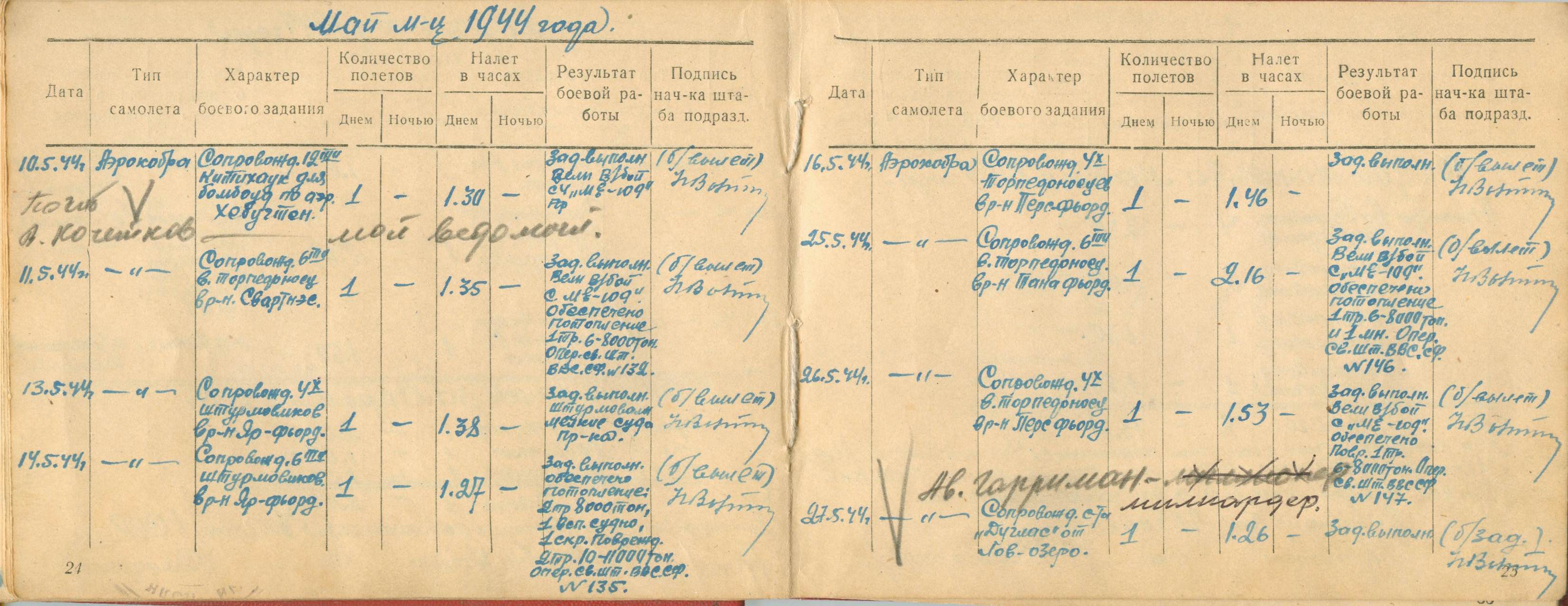 Дальше, в разграфленные столбики: «Дата – Тип самолета – Характер задания – Количество полетов – Налет в часах – Результат боевой работы – Подпись начальника штаба подразделения», – аккуратным мелким почерком вписаны результаты боевых вылетов истребителя отца.