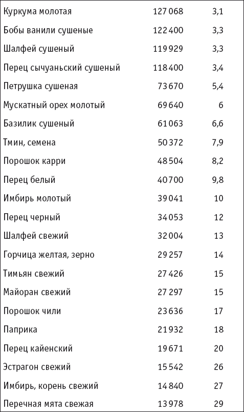 Чтобы представить себе, насколько анти– окислительные свойства пряностей приближены к ягодам, овощам и другим продуктам питания, посмотрим на общую таблицу САРК. Конечно, съесть тарелку ягод или фасоли, выпить чашку шоколада для нас естественней и здоровее, чем нагрузить сердце непосильной дозой хрена или нарушить пищеварение головкой чеснока! Но сегодня речь идет лишь о том, чтобы оздоровить питание всеми способами. Потому что наша экология уже не прощает нам невнимательного отношения к организму.