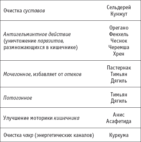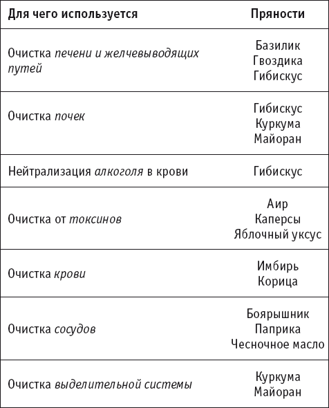 Большинство пряностей способствуют также и очистке организма. Уже хотя бы потому, что стимулируют пищеварительный процесс. Но не только! Многие специи, приправы и пряности отлично очищают и другие органы (см. таблицу на стр. 34–35), так что для полноценной очистки лучше использовать смеси приправ.