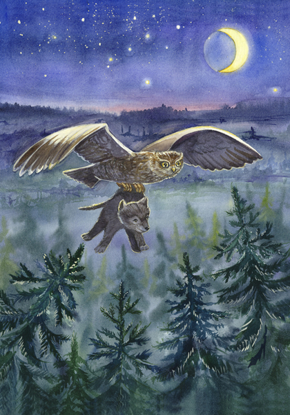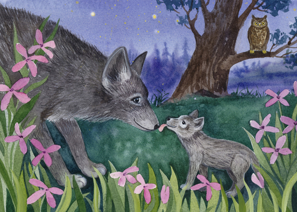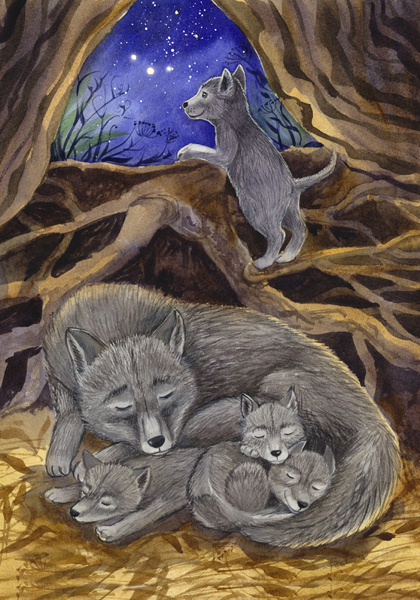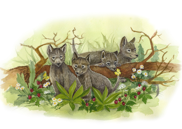 Когда стемнело, сова проснулась, а волчата отправились в нору. Мама-волчица напоила всех молоком, и малыши тут же уснули. Не спал, как всегда, только волчонок Даль.