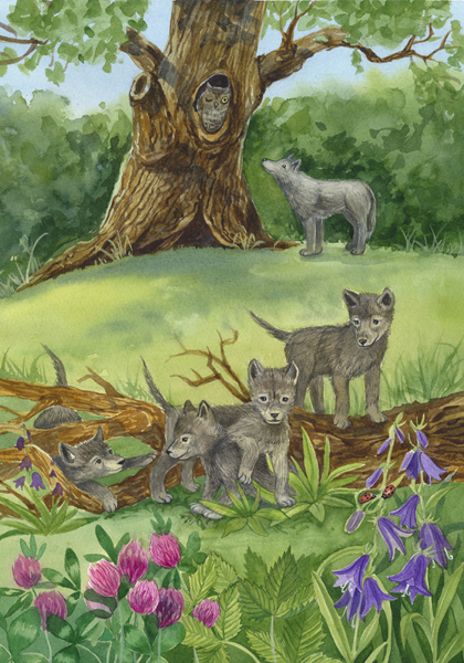 Утром волчата проснулись бодрыми, весёлыми и весь день играли под старым дубом. На этом дубе жила сова. Днём она всегда спала, а волчата будили её своими шумными играми. Так случилось и в этот раз.