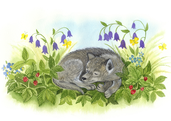 Волчонок Даль лёг в душистую траву, чтобы поиграть с бабочками, но тёплый ароматный ветер заставил его закрыть глаза и, сладко зевнув, он сразу же уснул.