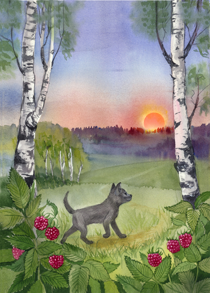 Шёл он долго, а дня всё не было. И когда он совсем уже терял силы, впереди показался тусклый свет. Постепенно всё вокруг становилось серым. Волчонок Даль подумал, что день уже близко, и, собрав последние силы, пошёл вперёд. Чем дальше он шёл, тем светлее становилось. Вокруг защебетали птицы, раскрылись цветы и появилось много разноцветных бабочек.