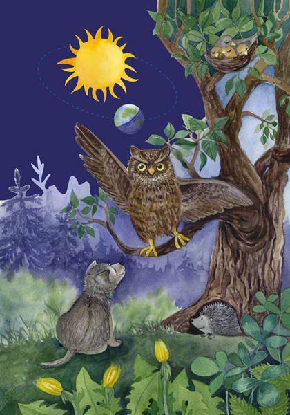 – А мы все, – продолжала сова, – живём на другом большом шаре, который называется Земля. Наша Земля всё время крутится, подставляя Солнцу то одну сторону, то другую. Когда сторона, на которой мы живём, поворачивается к Солнцу, у нас становится светло, и мы говорим, что к нам пришёл день. А когда она отворачивается от Солнца, у нас становится темно, и мы говорим, что к нам пришла ночь.