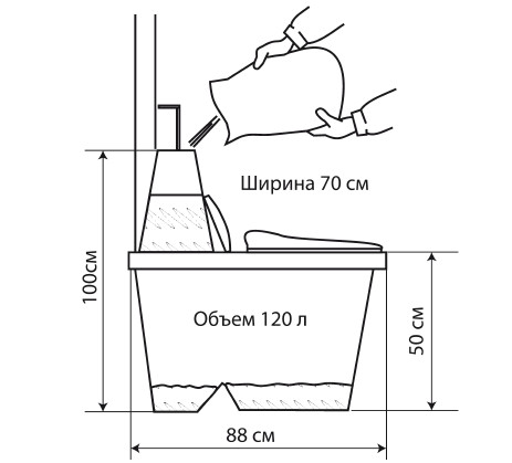 Присыпка отходов, собирающихся в ведре или металлическом ящике, расположенном под стульчаком, обеспечивает гигиеничность такого туалета. Варианты сыпучего материала для припудривания отходов – торф, торфяная смесь или крошка, опилки, зола, сухая садовая земля, сухой мусор. Причем при использовании мусора он тоже должен быть сыпучим и обладать абсорбирующими и дезинфицирующими свойствами.