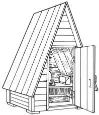 Уличный пудр-клозет традиционно выполняют в форме шалаша из щитов или досок (рис. 4): в такой конструкции справа и слева от стульчака удобно хранить ящики с наполнителем. Сверху на кровле необходим конек, а с торцов – окошки для проветривания (если не предусмотрена другая вентиляция). Стульчак изнутри защищают от попадания на дерево нечистот слоем рубероида и обшивают листовым железом. Выгребной люк может отсутствовать: иногда вместо него делают откидной верхнюю крышку стульчака и вынимают ведро с отходами через нее. Однако вариант с люком удобнее.