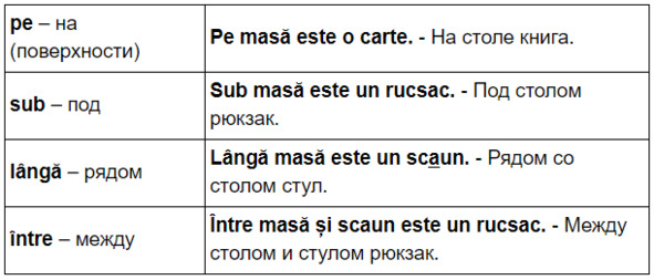 Ce este pe masă? 1) ___ (pe/la/în) masă sunt un calculator, un caiet (тетрадь), o carte (книга), un telefon, un manual (учебник), un pașaport și o vază 2) ___ (în/cu/la) o floare. 3) _____ (la/între/lângă) masă este un scaun. Pe scaun este un pix (ручка). 4) ____ (între/sub/la) pix și creion (карандаш) este o carte.