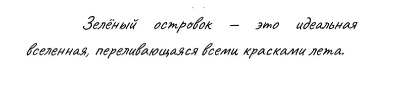 Зелёный островок – это идеальная вселенная, переливающаяся всеми красками лета. Остров освящён лучами солнца, пронизан дыханием ветра и пропитан родительской заботой и любовью. Здесь нет ощущения линейности времени и ограниченности пространства, здесь просто рыбачит отец, и запекает на углях картошку мать. На зелёном островке можно ловить невероятные рассветы и закаты, а дождь, который в обычном месте доводит до дрожи, здесь поглаживает кожу, кажется тёплым и ласковым. Одно удовольствие встать по пояс в чистой заводи, поднять лицо к небу и прочувствовать каждой своей клеточкой прохладную морось июньского ливня.