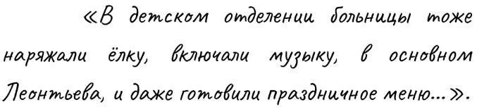 Зато сестрёнку привозили на выходные, и мы вместе ковыряли гипс, и чесали руку карандашом, просунув его внутрь. Я тогда впервые очень сильно соскучилась по ней, это было первое наше длительное расставание. И её первый зимний праздник вне дома. В детском отделении больницы тоже наряжали ёлку, включали музыку, в основном Леонтьева, и даже готовили праздничное меню, так что, особо скучать ей не пришлось.