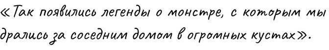 Спустя время, у меня и моих друзей появились игры чуть дальше от дома, и тогда маленький сосед стал нам мешать. Мы выдумывали смешные причины, почему он должен был идти домой. Так появились легенды о монстре, с которым мы дрались за соседним домом в огромных кустах. Друзья издавали звуки драк, били бутылки, швыряли палки, рисовали ссадины и синяки, мы создавали неповторимый антураж битвы за наш двор. Маленьким там точно было не место!