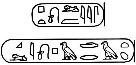 Два картуша (группа знаков, обведенных овальной рамкой), с которых Шампольон начал расшифровку иероглифов: «Птолемей»; «Клеопатра»
