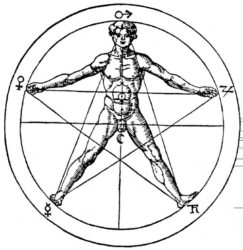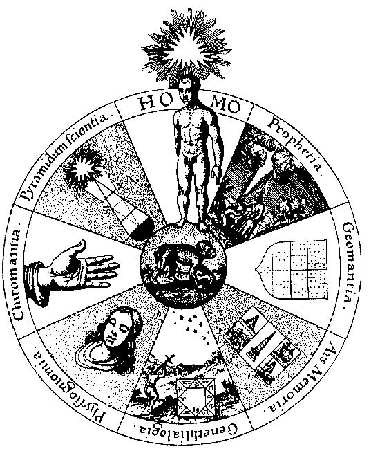 Сложным магическим символом можно считать гравюру из книги великого английского оккультиста XVII века Роберта Флудда. Круг как целое олицетворяет восемь предметов мистического исследования, наиболее важным из которых является сам Человек, изображенный нагим в верхней части круга. У ног его расположилась обезьянка. Изображение обезьяны в магическом символизме связано с определенной оккультной концепцией, однако в данном случае автор показал лишь, во что мог бы превратиться человек, если бы не стремился развивать свою высшую природу. Этот тезис не имеет ничего общего с теорией Дарвина о происхождении человека от обезьяны. Здесь скорее показано, насколько низшая природа человека схожа с природой обезьяны, и если человек не будет уделять должного внимания развитию своего духа, он легко может опуститься до примитивной, похожей на обезьянью жизни, управляемой лишь низшими желаниями.