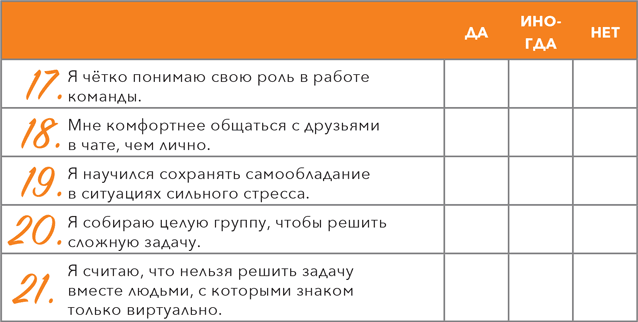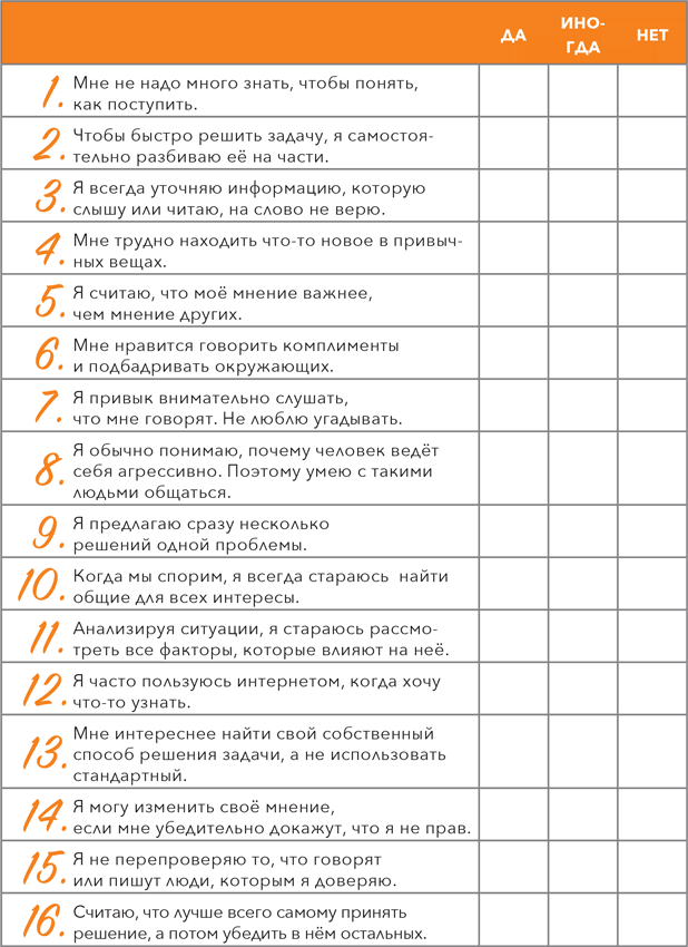 НАЧНЁМ С ТЕСТА, КОТОРЫЙ ПОМОЖЕТ ОПРЕДЕЛИТЬ, КАК У ТЕБЯ СЕЙЧАС ОБСТОЯТ ДЕЛА С КОММУНИКАЦИЕЙ. В КОНЦЕ КНИГИ Я ПОПРОШУ ТЕБЯ ПРОЙТИ ЕГО ЕЩЁ РАЗ, ЧТОБЫ ПОСМОТРЕТЬ, НАСКОЛЬКО ВЫРОСЛО ТВОЁ МАСТЕРСТВО.