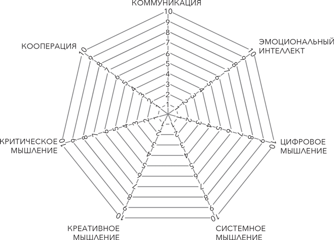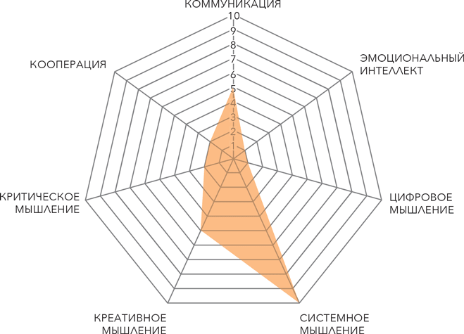Отметь точкой набранное количество баллов по каждому навыку на его шкале. Затем соедини получившиеся точки. Закрась фигуру изнутри. Ты увидишь свой портрет навыков XXI века. Посмотри, какой из них развит сильнее всего. Ниже прочти описание каждого варианта.