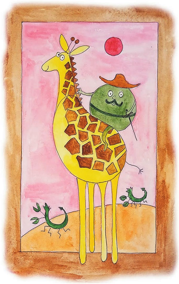 Что касается Вальки, он продолжил работу с жирафом, которому дорисовал рожки и пятна в виде многоугольников шоколадного цвета. Толстый наездник с усами и шляпой обзавёлся поясом и шпагой. За ними в розовом небе плавало малиновое солнце, а под ногами горбилась большая песчаная дюна. По ней сновали зелёные скорпионы.