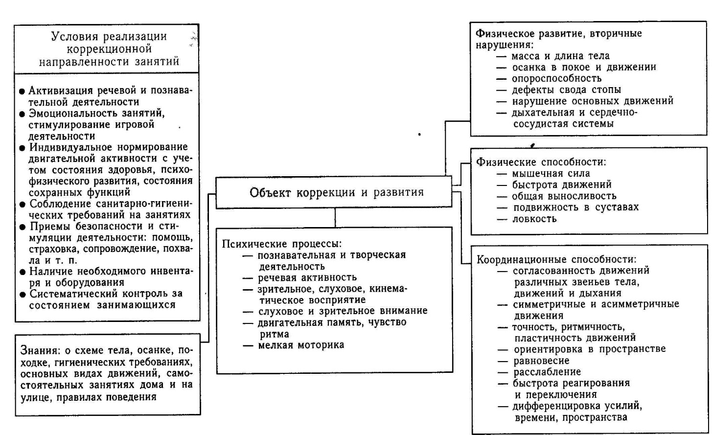 На рис. 1.1. в качестве иллюстрации представлена теоретическая модель адаптивного физического воспитания в дошкольных образовательных (коррекционных) учреждениях, его формы, направления коррекционноразвивающей работы и условия реализации. В каждой нозологической группе эти направления имеют собственные задачи, специфическое содержание, адекватный подбор средств, методов, методических приемов, соответствующих возрасту, условиям проведения занятий, типу учреждения [Л.В. Шапкова, 2007].