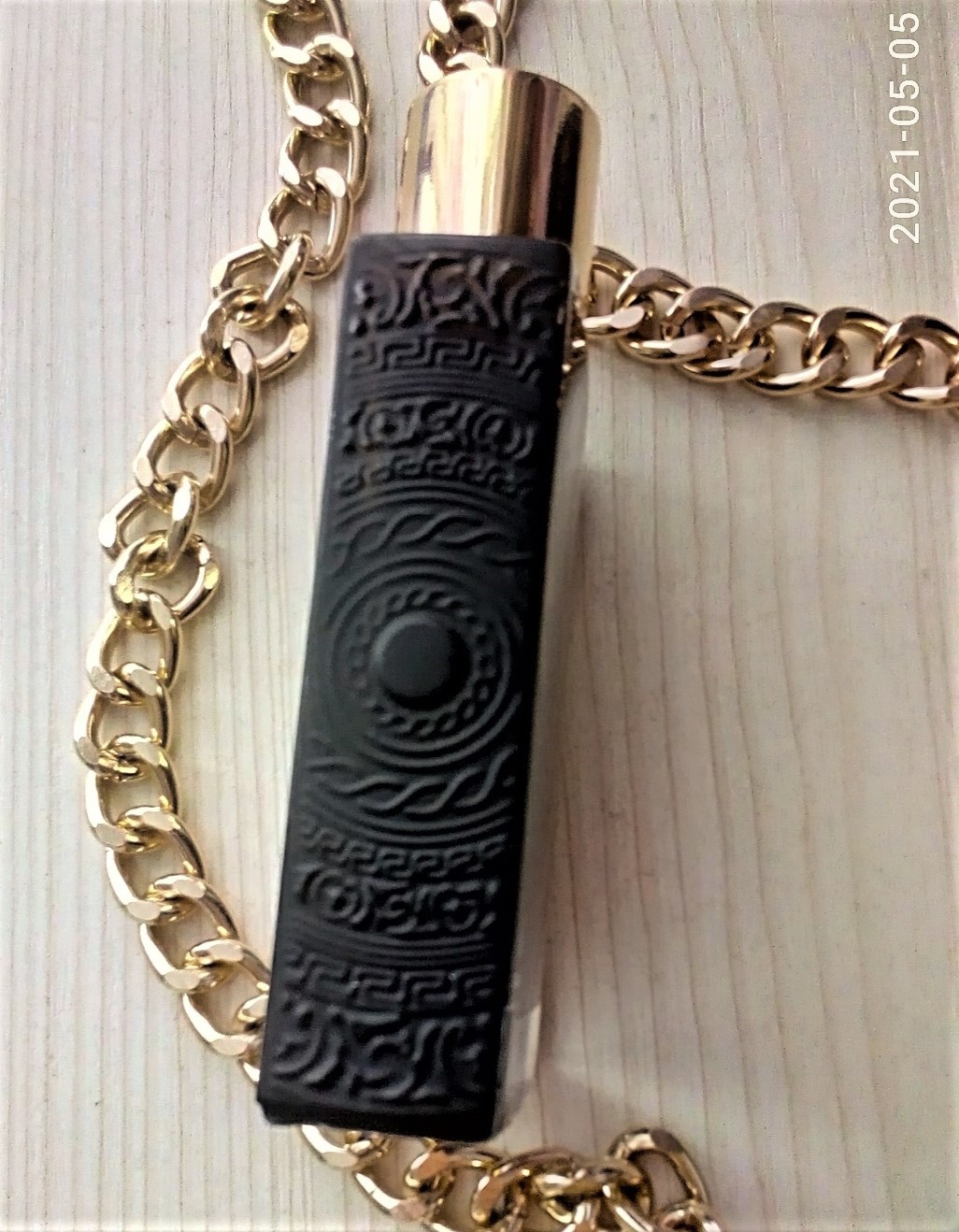 Теперь про сам флакон. Толстое стекло, черное внутри с гравировкой на золотой цельной с флаконом пластине. Ребро флакона матовое, рифленое, черное с круглым рисунком сплетающихся цепочек. На золотом колпачке выгравирована заглавная буква К.