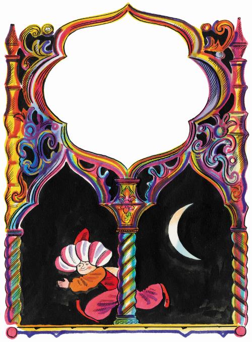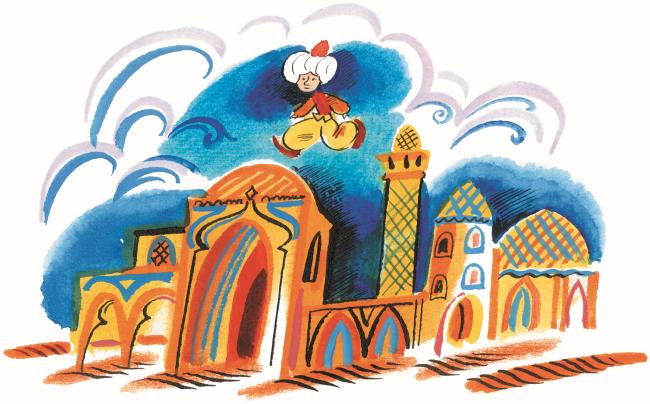 И вдруг туфли подняли его на воздух и быстро, как ветер, побежали по облакам. Не успел Маленький Мук опомниться, как очутился в городе, на базаре.