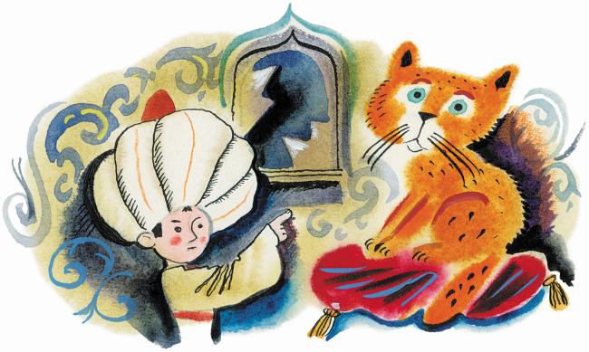 Муку понравился кошачий обед, и он согласился. У госпожи Ахавзи (так звали старуху) было два кота и четыре кошки. Каждое утро Мук расчёсывал им шёрстку и натирал её драгоценными мазями. За обедом он подавал им еду, а вечером укладывал их спать на мягкой перине и укрывал бархатным одеялом.