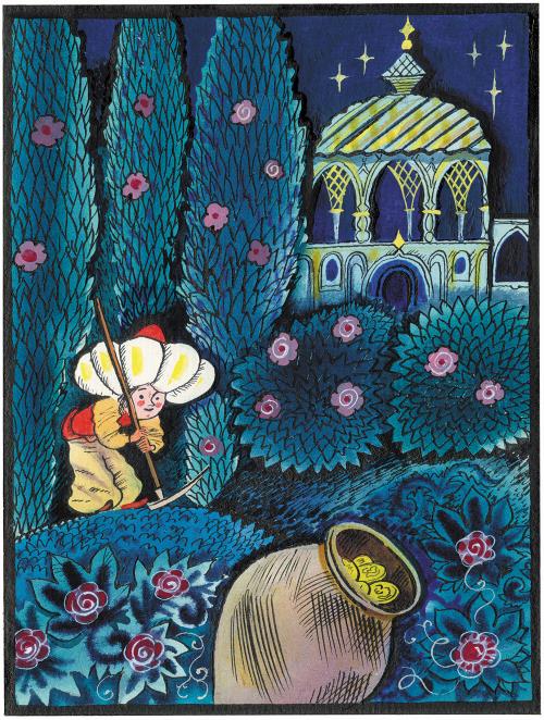 Долго трудился Маленький Мук, и наконец его заступ ударился обо что-то твёрдое. Карлик наклонился над ямой и нащупал руками в земле какую-то железную крышку. Он поднял эту крышку и обомлел. При свете луны перед ним засверкало золото. В яме стоял большой горшок, доверху наполненный золотыми монетами.