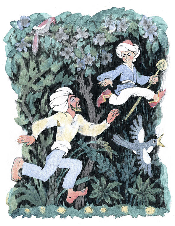 Мук быстро снял свои башмаки, надел огромные туфли, взял тросточку, выбежал из комнаты, поспешно навертел на голову отцовскую чалму, заткнул за пояс свой кинжал и побежал вон из дома, а там и из города. Бежал он быстрее, чем когда-нибудь в жизни, и не мог остановиться, как будто какая-то тайная сила тащила его. Наконец он заметил, что его несли туфли. Он пробовал остановиться, но не мог. Наконец он крикнул в отчаянии: «Ох! Ох! Стойте! Ох!» Туфли остановились. Мук в изнеможении упал на землю и заснул глубоким сном.