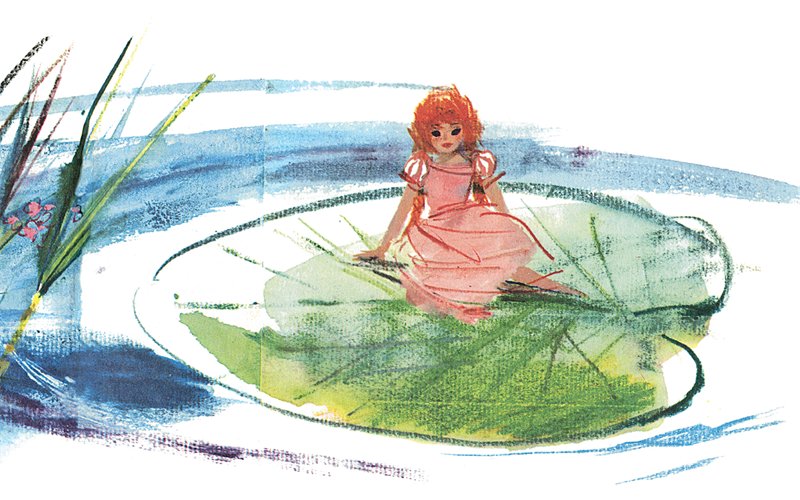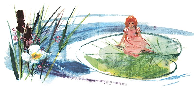 – Тише ты! Она ещё проснётся, пожалуй, да убежит от нас, – сказала старуха жаба. – Она ведь легче лебединого пуха! Высадим-ка её посередине реки на широкий лист кувшинки – это ведь целый остров для такой крошки, оттуда она не сбежит, а мы пока приберём там, внизу, наше гнёздышко. Вам ведь в нём жить да поживать.