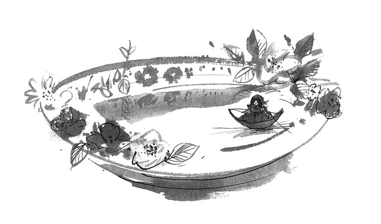 Блестящая лакированная скорлупка грецкого ореха была её колыбелькою, голубые фиалки – матрацем, а лепесток розы – одеяльцем; в эту колыбельку её укладывали на ночь, а днём она играла на столе. На стол женщина поставила тарелку с водою, а на края тарелки положила венок из цветов; длинные стебли цветов купались в воде, у самого же края плавал большой лепесток тюльпана. На нём Дюймовочка могла переправляться с одной стороны тарелки на другую; вместо вёсел у неё были два белых конских волоса. Всё это было прелесть как мило! Дюймовочка умела и петь, и такого нежного, красивого голоска никто ещё не слыхивал!