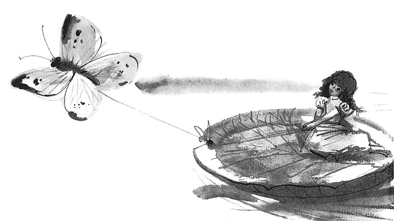 Красивый белый мотылёк всё время порхал вокруг неё и наконец уселся на листок – уж очень ему понравилась Дюймовочка! А она ужасно радовалась: гадкая жаба не могла теперь догнать её, а вокруг всё было так красиво! Солнце так и горело золотом на воде! Дюймовочка сняла с себя пояс, одним концом обвязала мотылька, а другой привязала к своему листку, и листок поплыл ещё быстрее.