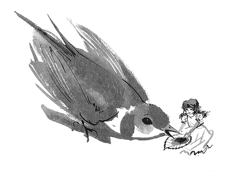 Девочка вся задрожала от испуга – птица ведь была в сравнении с крошкой просто великаном, – но всё-таки собралась с духом, ещё больше закутала ласточку, потом сбегала принесла листок мяты, которым накрывалась вместо одеяла сама, и покрыла им голову птички.