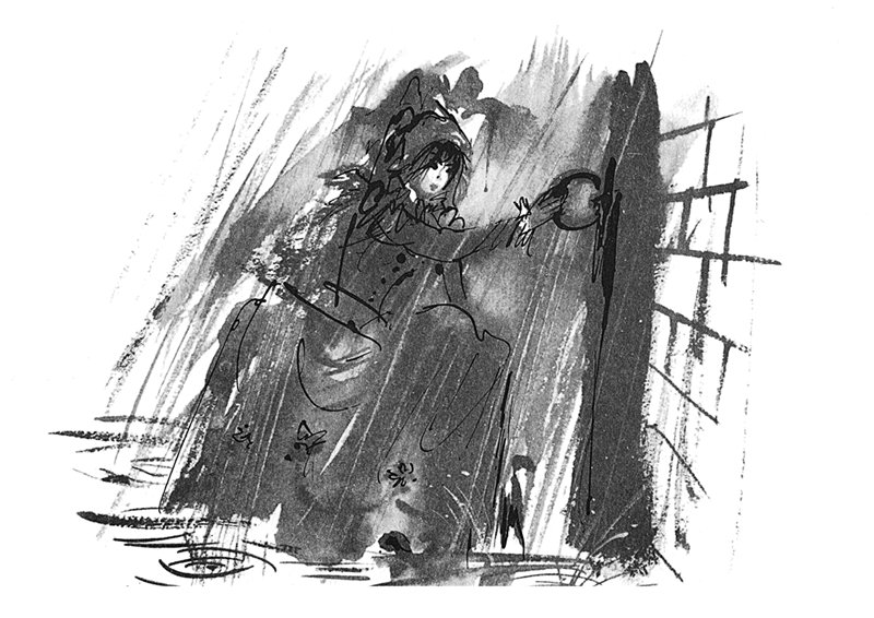 Крот опять заткнул дыру в потолке и проводил дам обратно. Но девочке не спалось ночью. Она встала с постели, сплела из сухих былинок большой славный ковёр, снесла его в галерею и завернула в него мёртвую птичку; потом отыскала у полевой мыши пуху и обложила им всю ласточку, чтобы ей было потеплее лежать на холодной земле.